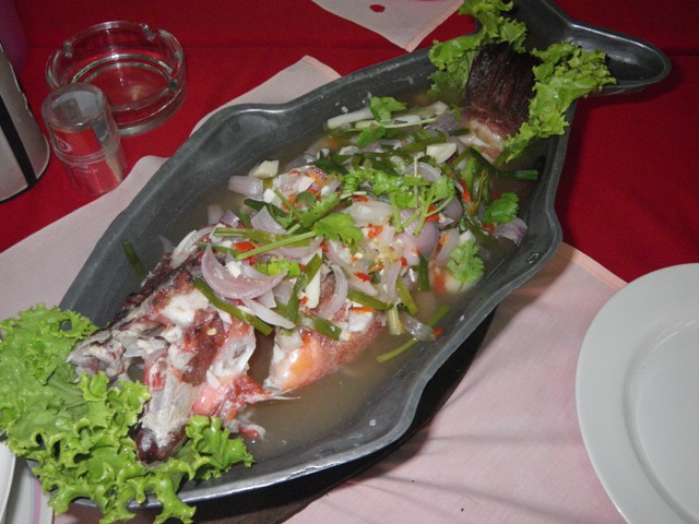 「PHA KAPONG NUENG MANAO(Steamed Seabass with Garlic and Lime Sauce)」270Baht、
