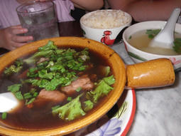 福建麺100B.と豚足汁麺140B.。あとマンゴーライス80B.にビール。