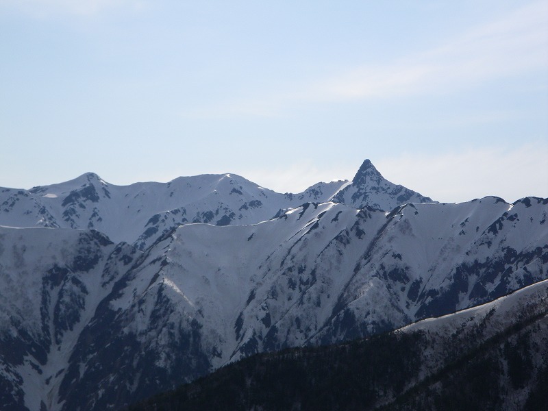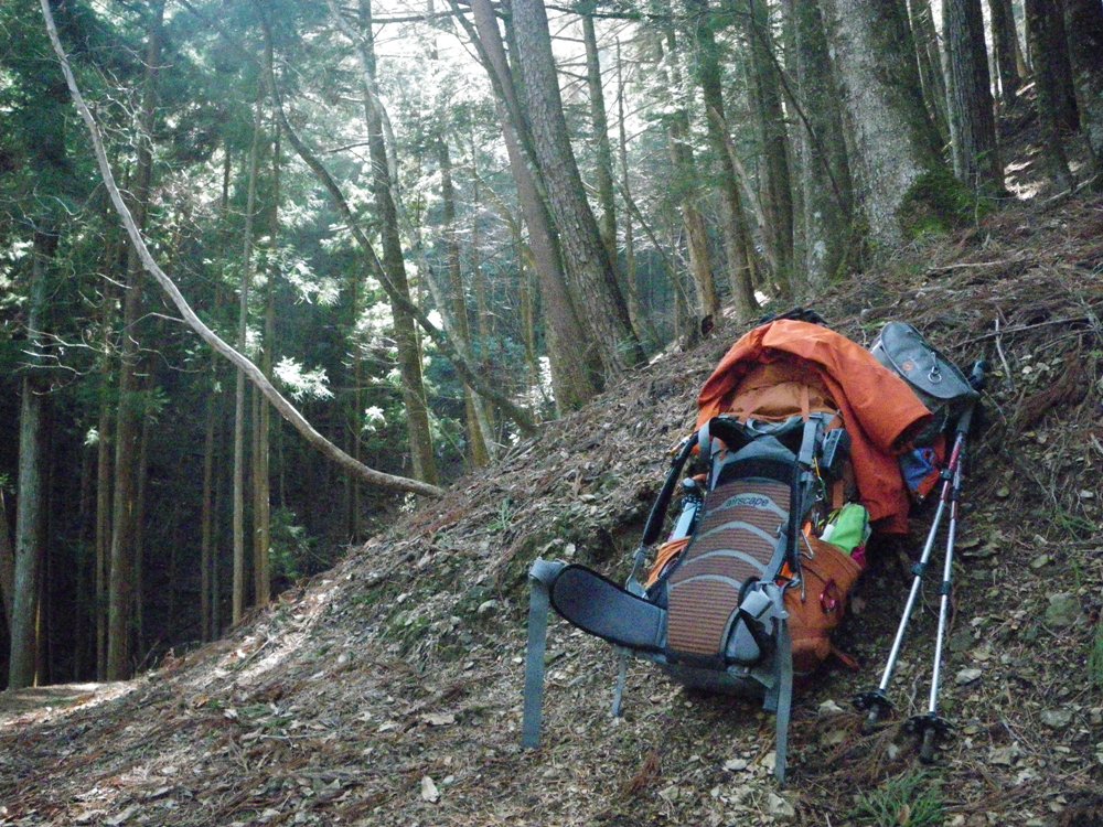 12:25古御山。直前の急斜面の途中で、あまりに風が気持ちよく抜けていくので木の根元に置いたリュックに座って10分ほど休んでしまった。水も飲んだ。